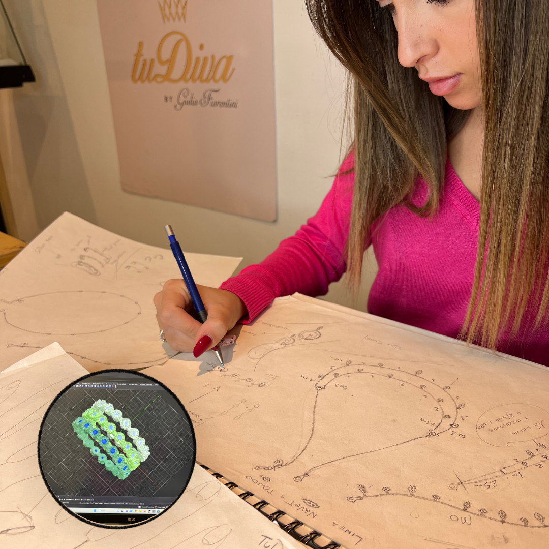 Il viaggio di ogni gioiello TuDiva prende il via dall'ideazione del prodotto. Guidati dalla visione artistica di Giulia, esploriamo un'ampia gamma di concept, lavorando con passione fino a delineare un design esclusivo che incarni l'essenza dell'eleganza e della qualità TuDiva.