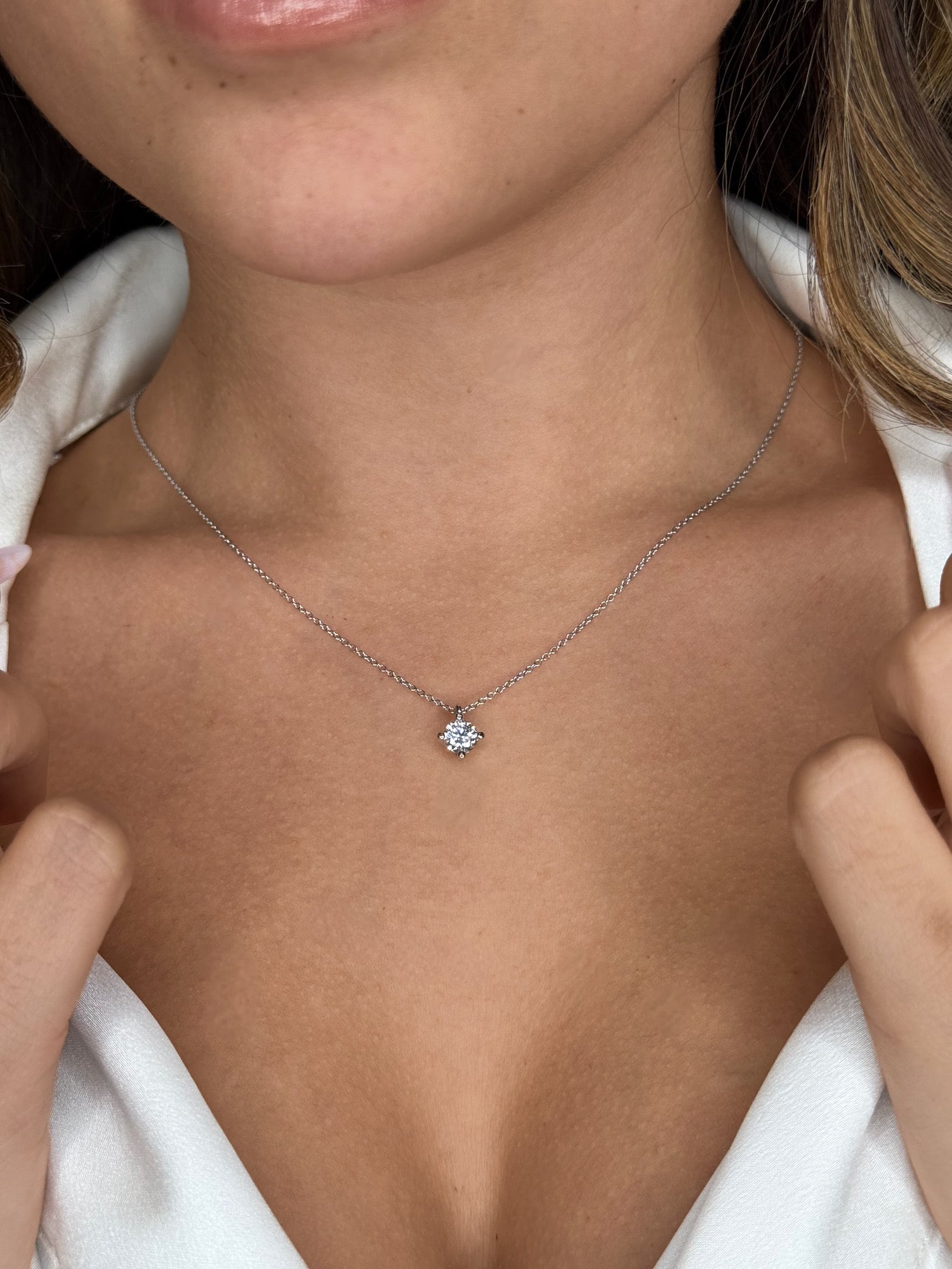Questa collana in oro 750 presenta un diamante lab-grown da 0,70 ct taglio brillante, incastonato in una montatura essenziale che esalta tutta la sua luminosità.